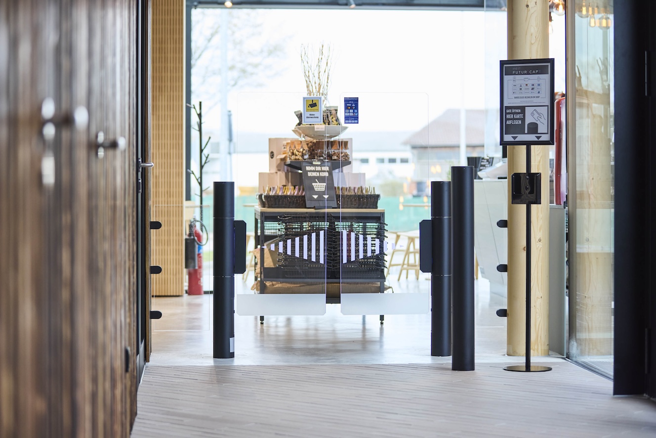 Von außen verleiht eine dunkle Holzfassade dem Gebäude seinen markanten Charakter. Im Inneren öffnet sich der Raum mit hellem Holz und großzügigen Fensterfronten zu einem lichtdurchfluteten Atrium. Schon die eindrucksvolle Architektur des KNEXT Showrooms lässt erahnen, was Besucher im Inneren erwartet: ein Ort der Begegnung – mit innovativem Design, einladender Atmosphäre und hochmoderner technischer Ausstattung. Vor dem Eintritt authentifizieren sich die Mitarbeiter an einer freistehenden Zutritts-Stele per Scan des Firmenausweises. Anschließend öffnet sich das zweiflügelige Eingangsgate Galaxyport von Wanzl und man kann sich frei im Shop und Restaurant bewegen. Im Verkaufsbereich steht eine große Auswahl an gekühlten Getränken, gesunden Mahlzeiten sowie leckeren Snacks aus der Region für die Gäste des Mitarbeiterrestaurants bereit. Wer seine kulinarische Wahl getroffen hat, genießt sie wahlweise in der stilvollen Lounge, dem exklusiven Wintergarten oder – bei schönem Wetter – auf der sonnigen Piazza. Gut gestärkt und entspannt geht es anschließend zu einer der beiden Self-Checkout-Kassen. Den Showroom verlässt man schließlich wieder über das Galaxyport von Wanzl.